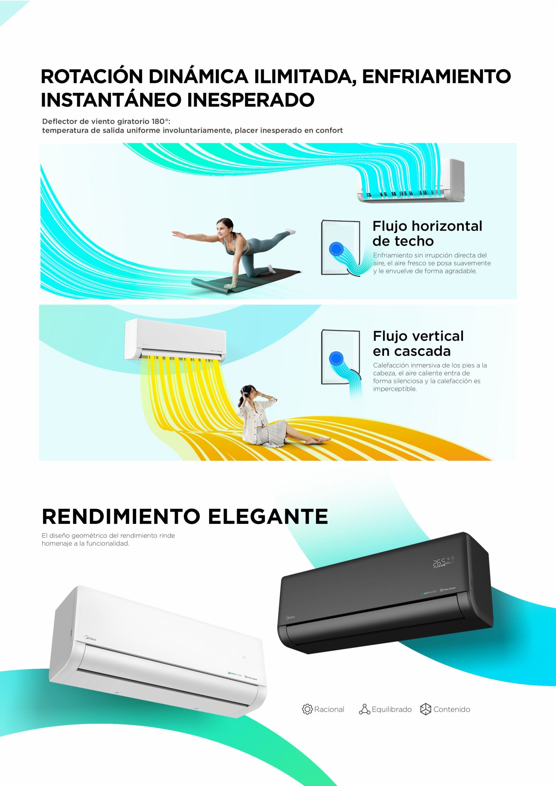 Distribución uniforme del aire mediante rotación de la lama en 180°, evitando corrientes directas y mejorando el confort.