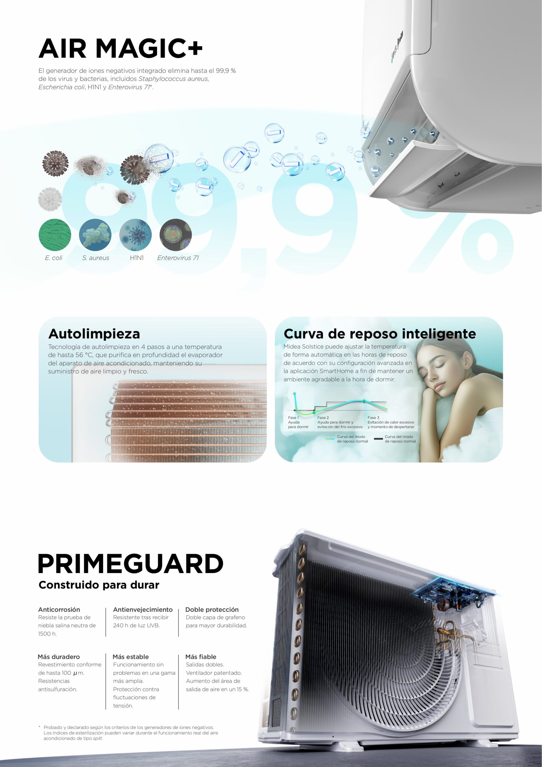 Además, incorpora un filtro de carbón activo, modo Silence para un funcionamiento ultrasilencioso desde solo 19 dB(A), y un sistema de autolimpieza inteligente que alcanza hasta 56 °C, eliminando bacterias, polvo y moho del evaporador. La unidad exterior está protegida con tecnología Hyper Graphfins, una doble capa de grafeno que mejora la resistencia a la corrosión, el envejecimiento por rayos UV y la salinidad, ideal para climas húmedos o costeros. También incluye Air Magic+, que genera iones negativos para neutralizar hasta el 99,9 % de virus y bacterias como E. coli, H1N1 y Staphylococcus aureus, manteniendo el aire interior limpio y saludable.