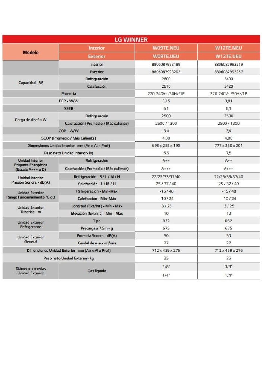 Con una potencia de 3,4 kW en refrigeración (equivalente a 2.924 frigorías) y 3,42 kW en calefacción (equivalente a 2.941 kcalorías), el LG W12TE Winner es perfecto para climatizar estancias de hasta 32 m². Ofrece un rendimiento excepcional durante todo el año, tanto en verano como en invierno. Su clasificación energética A++ en refrigeración y A+++ en calefacción lo convierte en una opción altamente eficiente, manteniendo temperaturas agradables sin un incremento significativo en el consumo eléctrico.