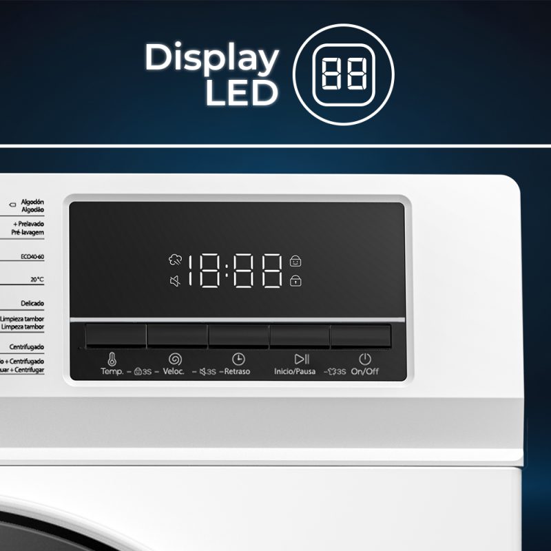 Estética blanca con puerta XXL oscuro, tambor de acero inoxidable. Sistema de control electrónico con Display LED con 16 programas de lavado y funciones para garantizar el mejor resultado y cuidado en tu colada.