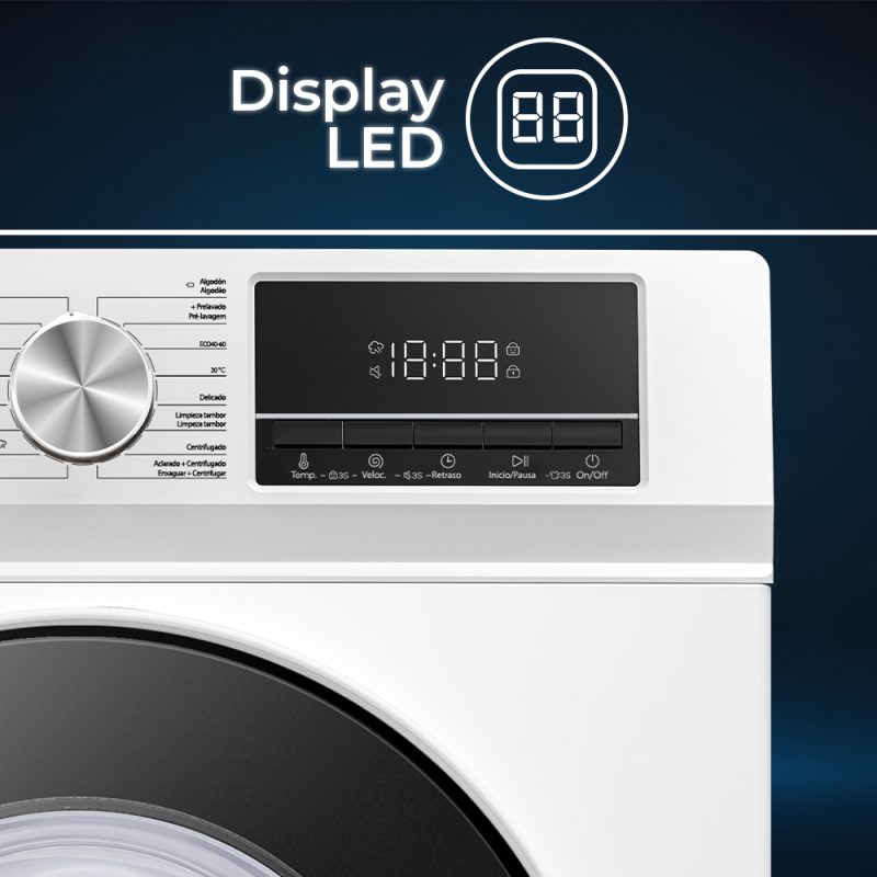 Estética blanca con puerta XXL oscuro, tambor de acero inoxidable. Sistema de control electrónico con Display LED con 16 programas de lavado y funciones para garantizar el mejor resultado y cuidado en tu colada.